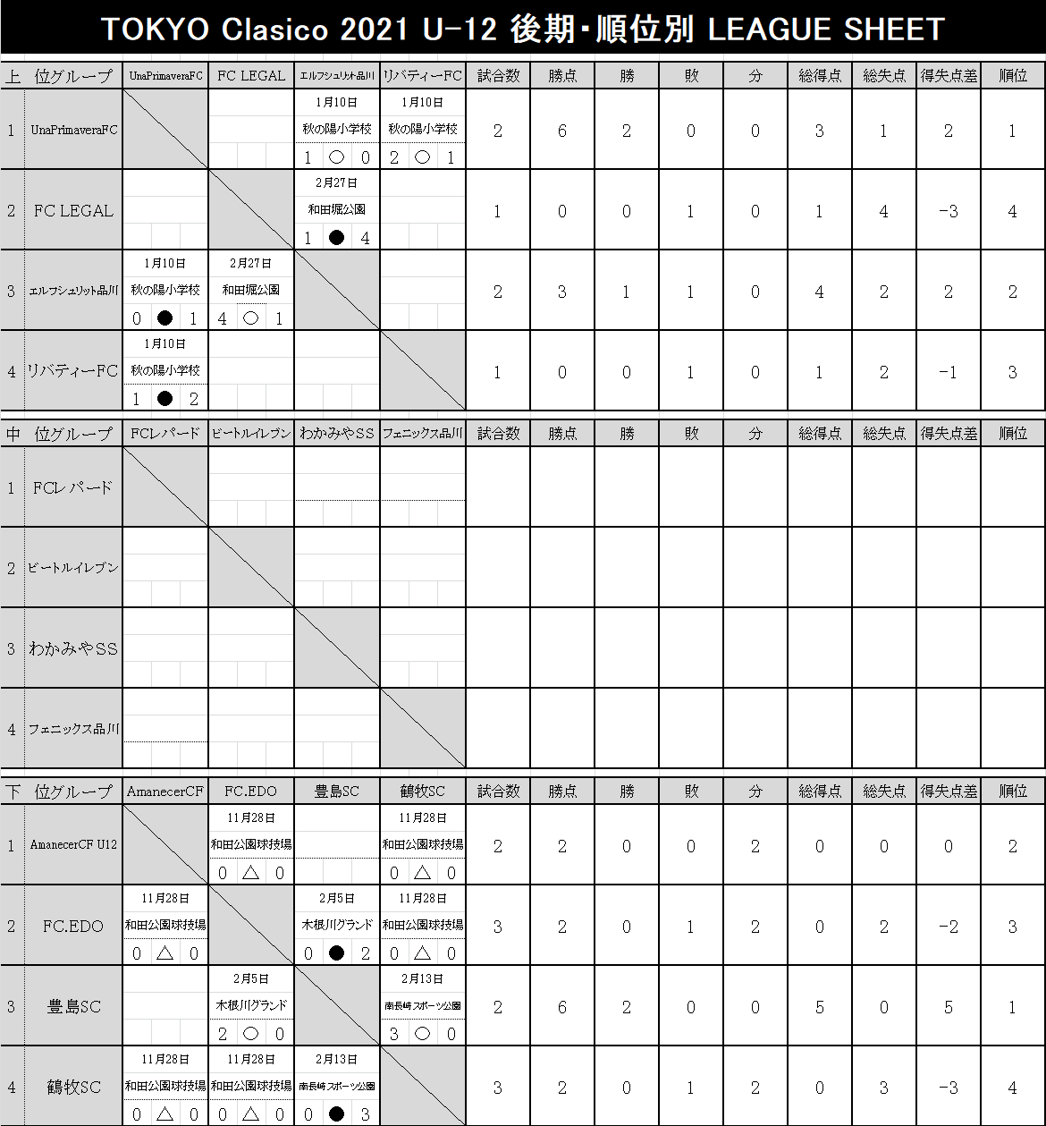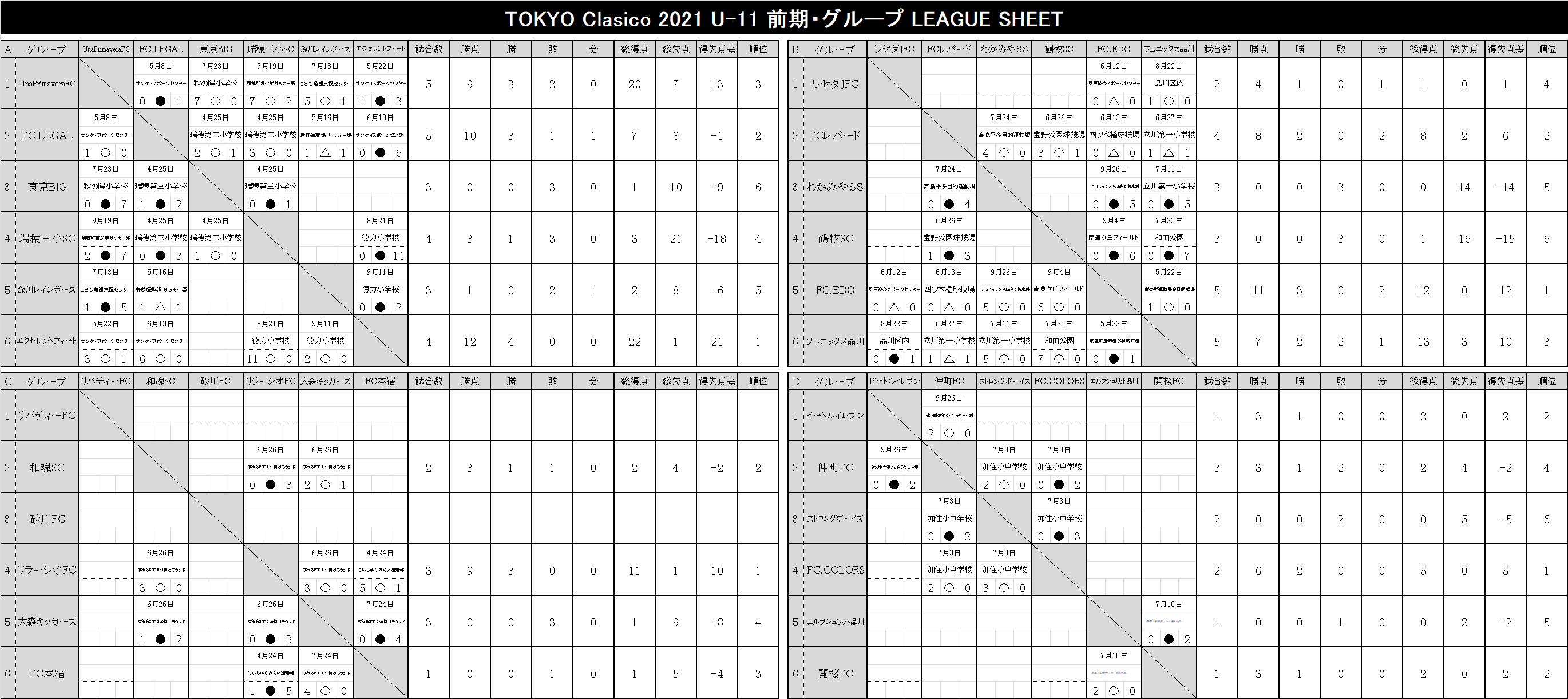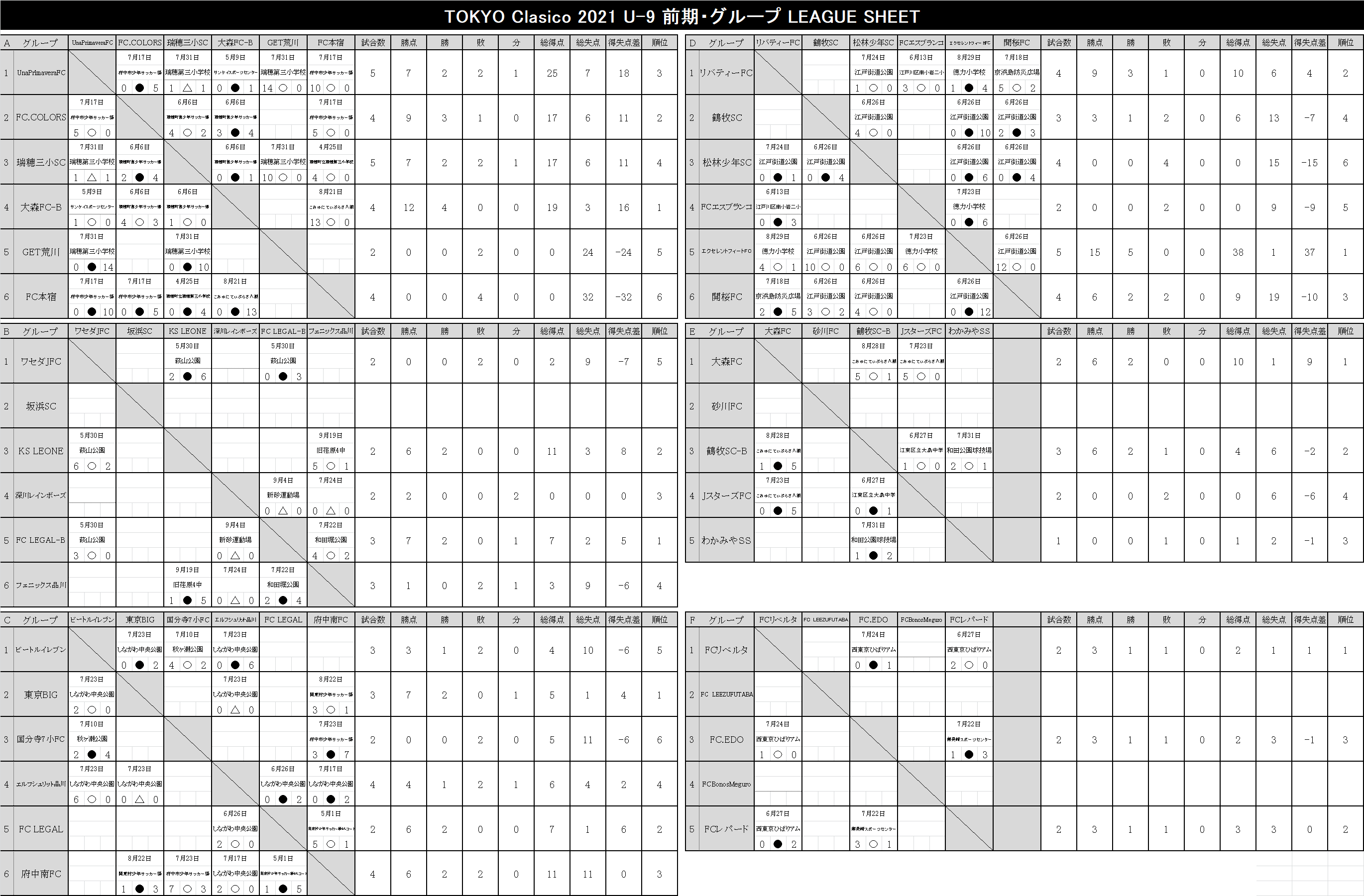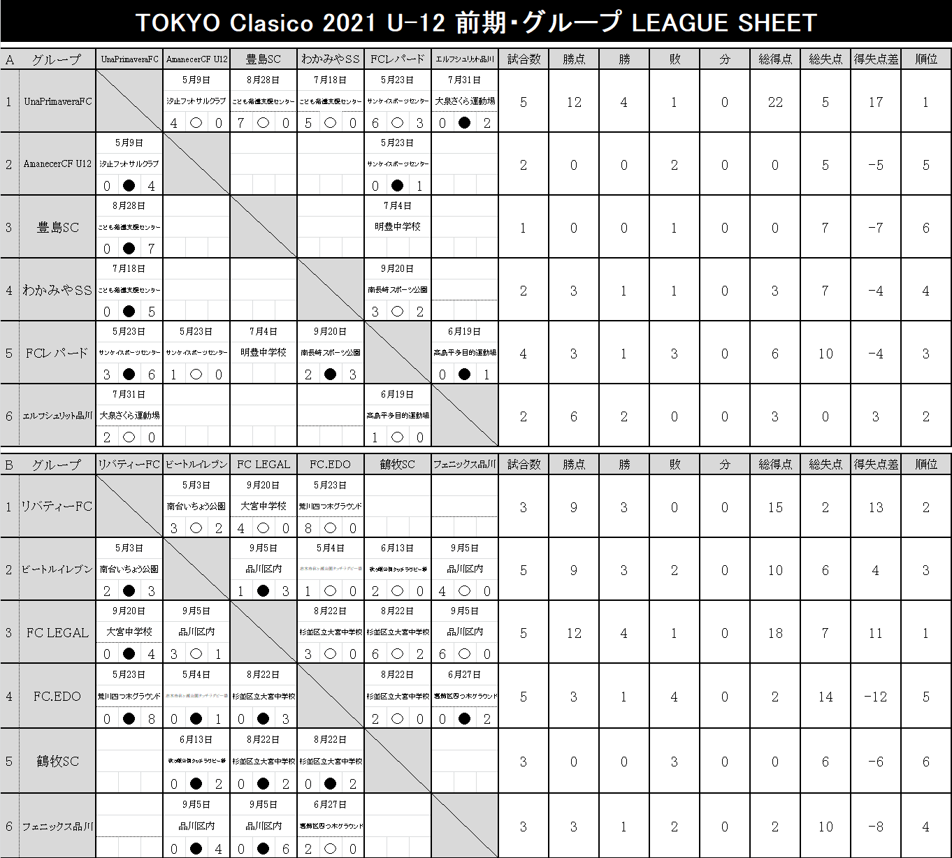 2021 順位表 2022.03.13更新【U-12】TOKYO-CLASICO-2021.xlsx【U-11】TOKYO-CLASICO-2021.xlsx【U-10】TOKYO-CLASICO-2021.xlsx【U-9】TOKYO-CLASICO-2021.xlsx【U-8】TOKYO-CLASICO-2021.xlsx 後期リーグ 2022.03.13更新 【U-12】TOKYO-CLASICO-2021.xlsx 【U-11】TOKYO-CLASICO-2021.xlsx 【U-10】TOKYO-CLASICO-2021.xlsx 【U-9】TOKYO-CLASICO-2021.xlsx 【U-8】TOKYO-CLASICO-2021.xlsx 前期リーグ 2021.09.27更新 【U-12】TOKYO-CLASICO-2021.xlsx 【U-11】TOKYO-CLASICO-2021.xlsx 【U-10】TOKYO-CLASICO-2021.xlsx 【U-9】TOKYO-CLASICO-2021.xlsx 【U-8】TOKYO-CLASICO-2021.xlsx 決勝大会 過去の大会結果 2020シーズン Entry エントリー 参加チーム募集。 東京クラシコでは、U-8~U-12ジュニア年代のコミュニティとして、各クラブの繋がりが広がる環境づくりに貢献します。ぜひ、お気軽に申込ください。 今すぐエントリー ページトップへ