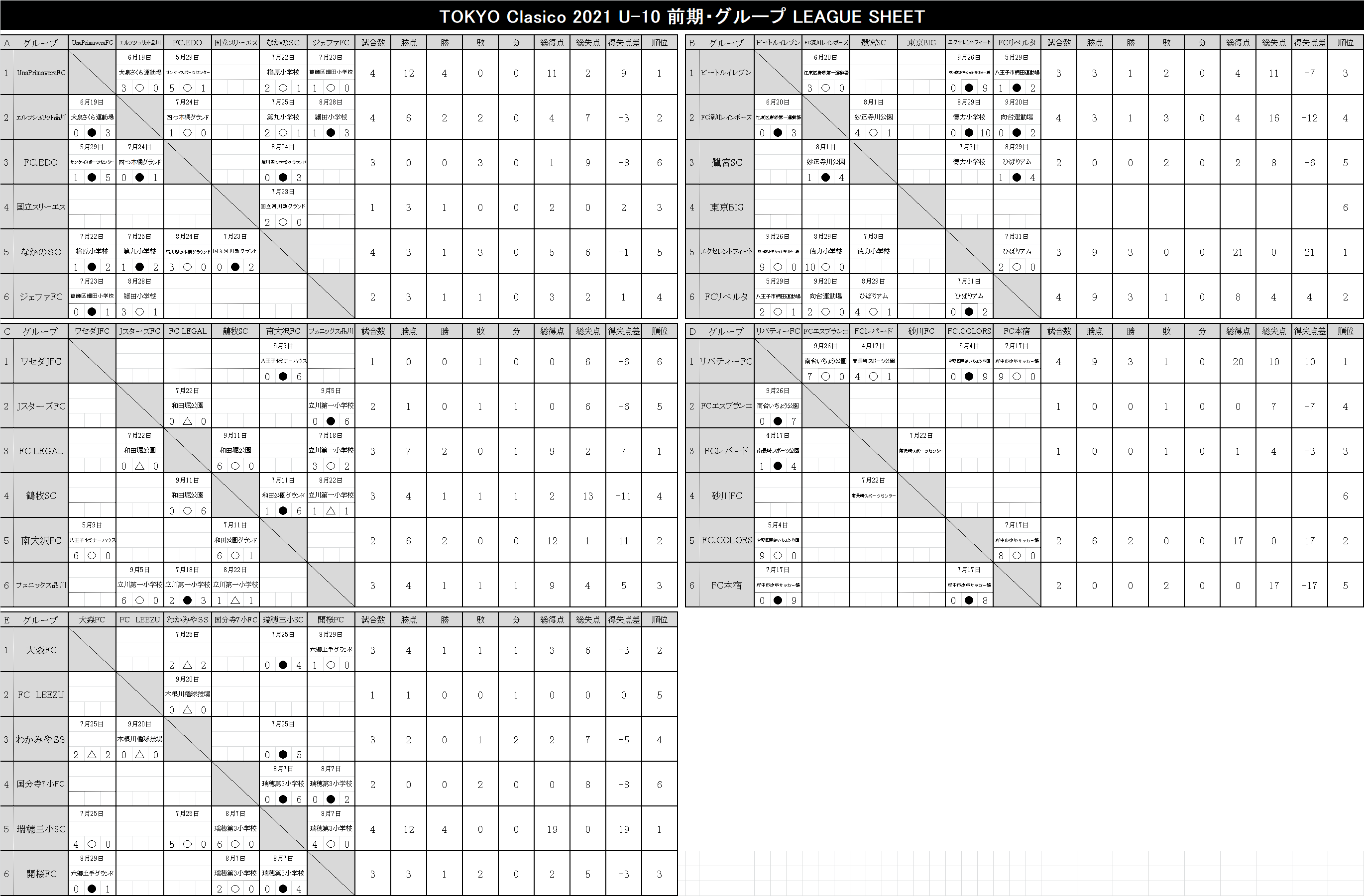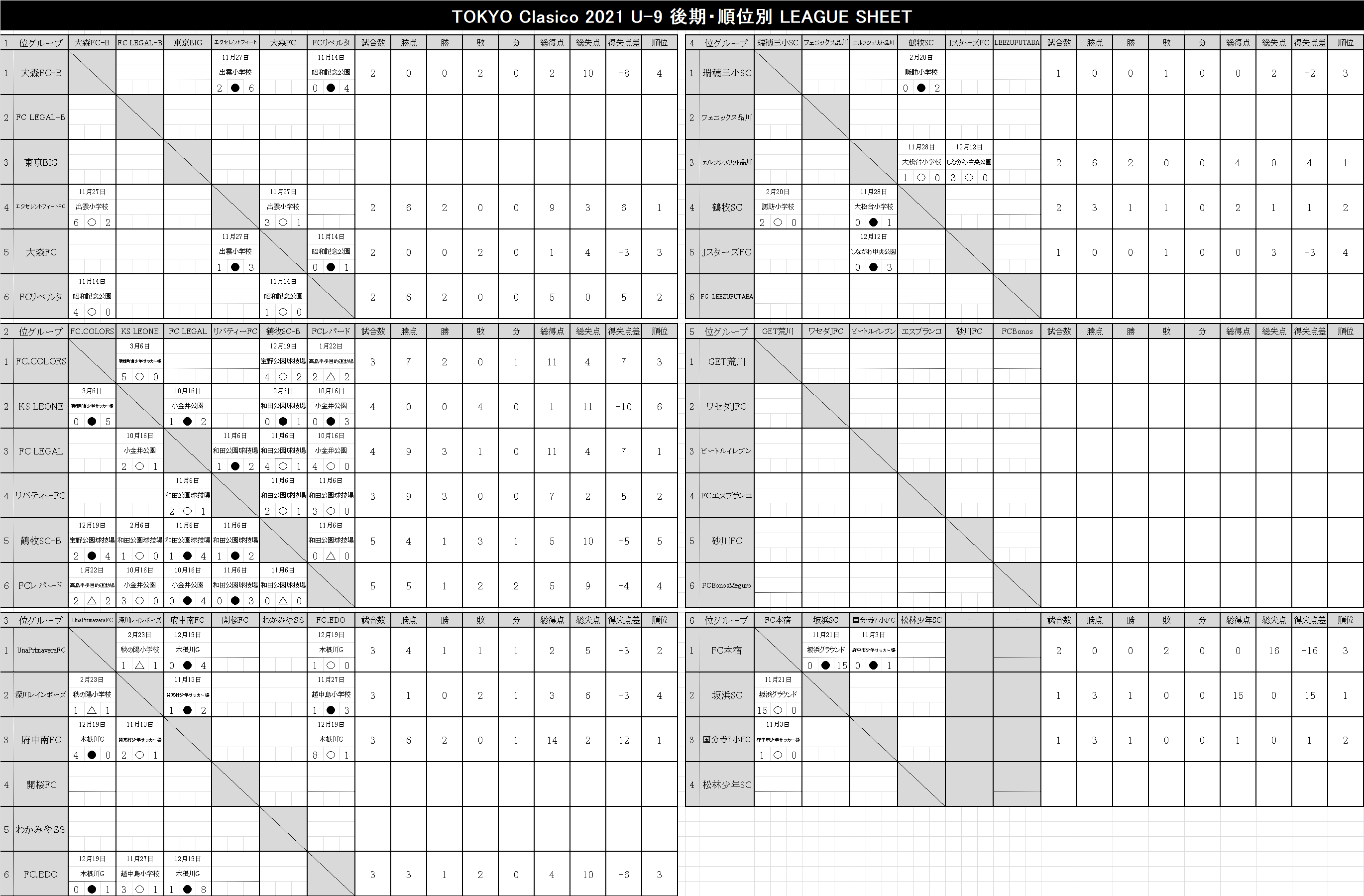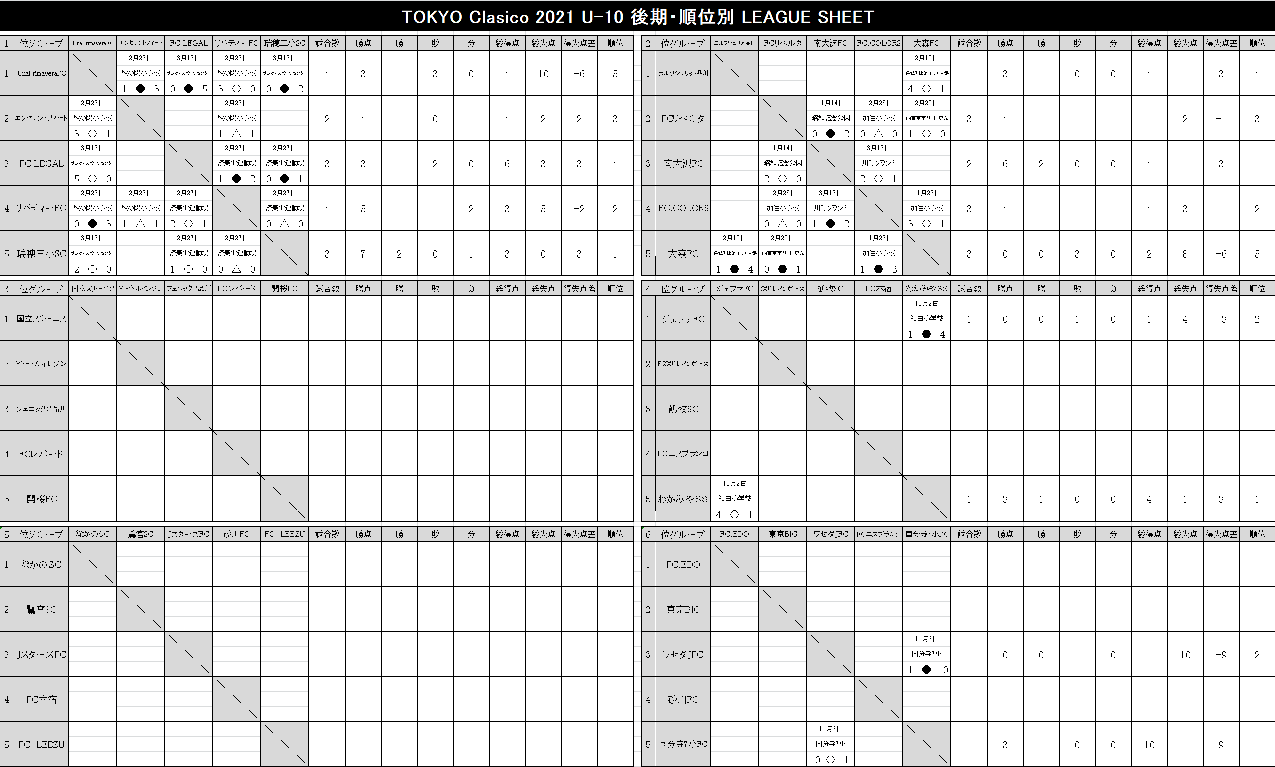 2021 順位表 2022.03.13更新【U-12】TOKYO-CLASICO-2021.xlsx【U-11】TOKYO-CLASICO-2021.xlsx【U-10】TOKYO-CLASICO-2021.xlsx【U-9】TOKYO-CLASICO-2021.xlsx【U-8】TOKYO-CLASICO-2021.xlsx 後期リーグ 2022.03.13更新 【U-12】TOKYO-CLASICO-2021.xlsx 【U-11】TOKYO-CLASICO-2021.xlsx 【U-10】TOKYO-CLASICO-2021.xlsx 【U-9】TOKYO-CLASICO-2021.xlsx 【U-8】TOKYO-CLASICO-2021.xlsx 前期リーグ 2021.09.27更新 【U-12】TOKYO-CLASICO-2021.xlsx 【U-11】TOKYO-CLASICO-2021.xlsx 【U-10】TOKYO-CLASICO-2021.xlsx 【U-9】TOKYO-CLASICO-2021.xlsx 【U-8】TOKYO-CLASICO-2021.xlsx 決勝大会 過去の大会結果 2020シーズン Entry エントリー 参加チーム募集。 東京クラシコでは、U-8~U-12ジュニア年代のコミュニティとして、各クラブの繋がりが広がる環境づくりに貢献します。ぜひ、お気軽に申込ください。 今すぐエントリー ページトップへ