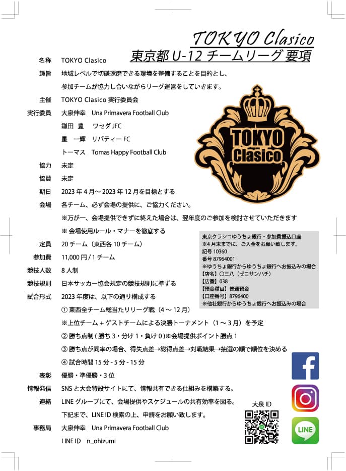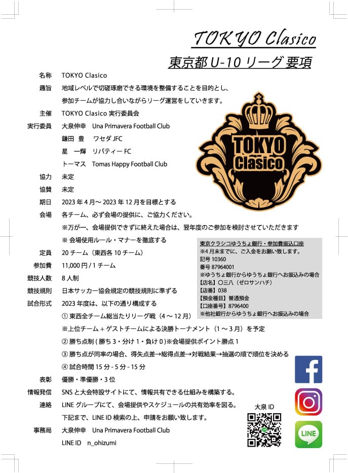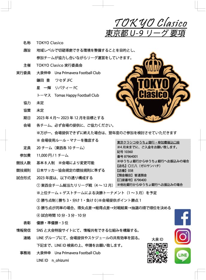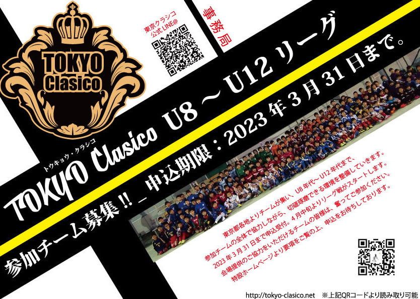 東京クラシコ 2023大会要項 2023東京クラシコに参加希望の方は、必ず下記、大会要項をご覧の上、申込くださいますようお願い致します。※画像をクリックすると拡大されます※画像下の文字をクリックするとPDFが表示されます 2023募集DL . U-12要項DL U-11要項DL U-10要項DL U-9要項DL U-8要項DL ,facebook,,{"facebookPageUrl":"https://www.facebook.com/tokyo.clasico/","boxHeight":"800","boxWidth":"100","dispFace":true,"dispUpdate":true,"dispHeader":true,"wUnit":"%","hUnit":"px"} Entry エントリー 参加チーム募集。 東京クラシコでは、U-8~U-12ジュニア年代のコミュニティとして、各クラブの繋がりが広がる環境づくりに貢献します。ぜひ、お気軽に申込ください。 今すぐエントリー ページトップへ