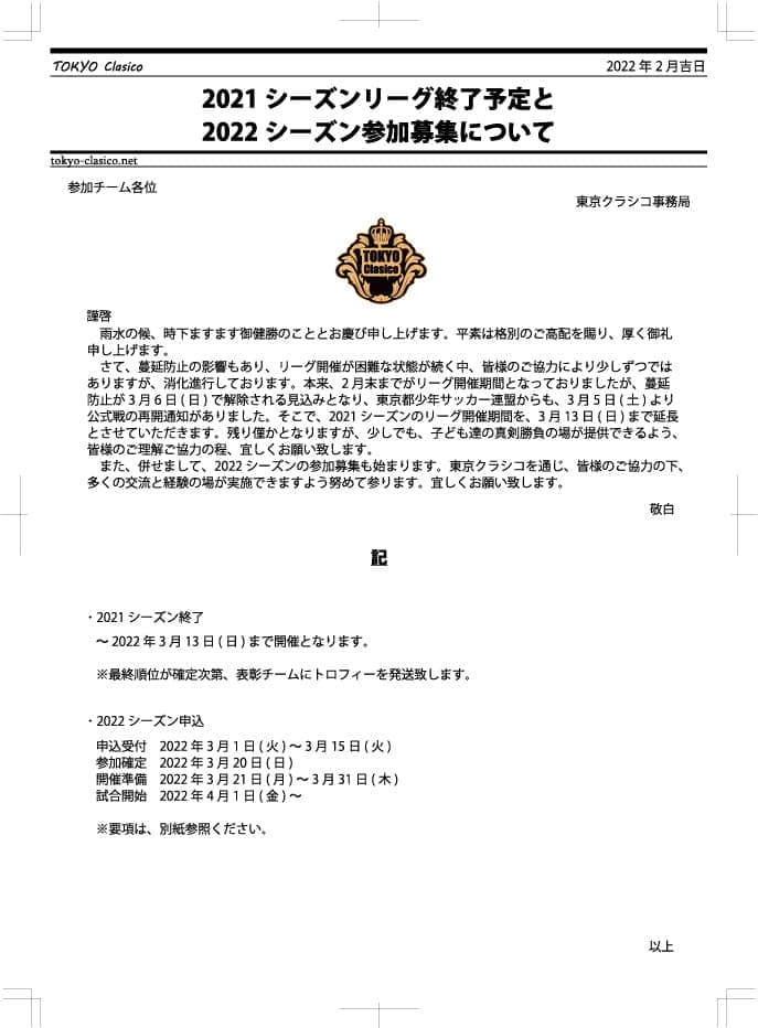 蔓延防止の影響もあり、リーグ開催が困難な状態が続く中、皆様のご協力により少しずつではありますが、消化進行しております。本来、2月末までがリーグ開催期間となっておりましたが、蔓延防止が3月6日(日)で解除される見込みとなり、東京都少年サッカー連盟からも、3月5日(土)より公式戦の再開通知がありました。そこで、2021シーズンのリーグ開催期間を、3月13日(日)まで延長
