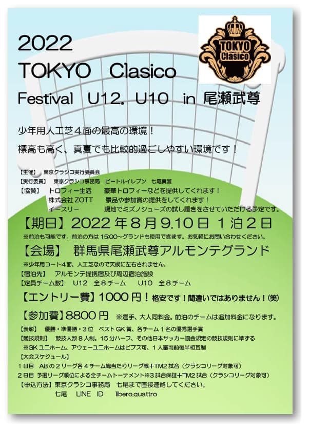 東京クラシコ参加チームの皆様も、参加されていないチームの皆様(東京都外のチームも大歓迎)も、一緒に充実した夏休みを過ごしましょう・